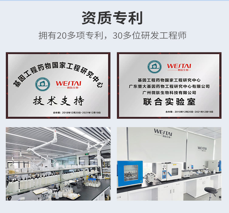 2015年成立廣州微肽生物科技有限公司,專注自有專業(yè)線品牌的生產(chǎn)及同類產(chǎn)品的OEM/ODM/OBM生產(chǎn)加工。2016年工廠通過了歐盟ISO22716和美國(guó)GMPC雙重認(rèn)證,2018年公司作為暨大基因藥物工程研究中心有限公司化妝品科技成果轉(zhuǎn)化企業(yè),以百年暨南大學(xué)暨大基因藥物工程研究中心為技術(shù)依托,致力于將生物高科技技術(shù)應(yīng)用于美容護(hù)膚領(lǐng)域,進(jìn)行生物護(hù)膚新原料、功能性美容護(hù)膚的研發(fā)與生產(chǎn)。