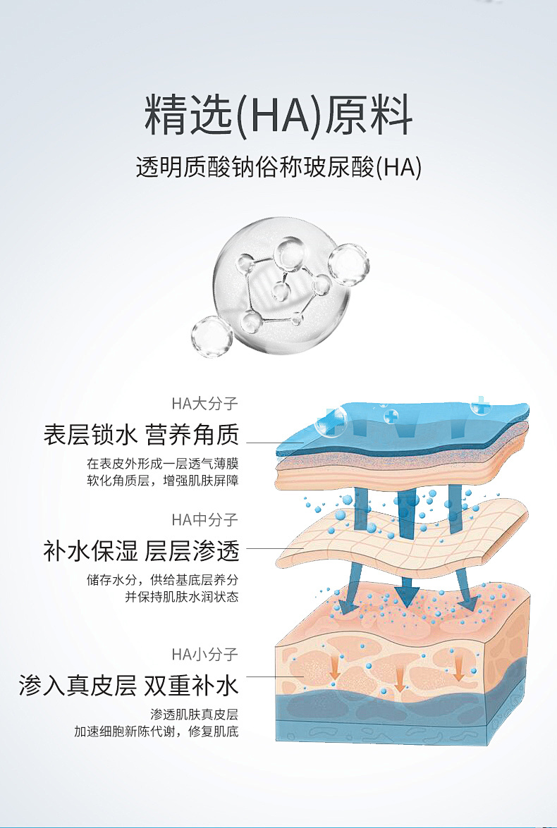 ? 促進(jìn)滲透:小分子透明質(zhì)酸鈉具有優(yōu)異的皮膚滲透性,能夠深入真皮層,提升儲(chǔ)水能力,從內(nèi)而外改善肌膚干燥。