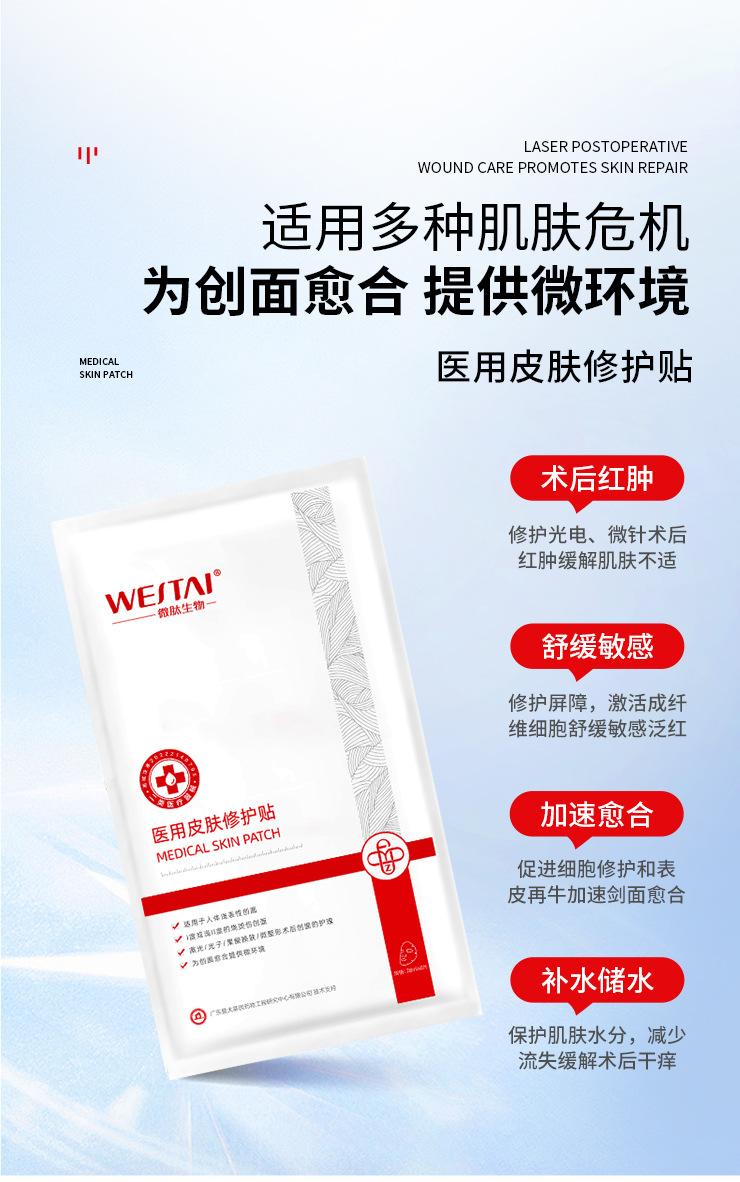 在醫(yī)療美容與皮膚修復(fù)領(lǐng)域,械字號(hào)醫(yī)用敷料因其高安全性、強(qiáng)功效性及合規(guī)性,成為醫(yī)院、藥店及美容院專業(yè)線的核心產(chǎn)品。微肽生物醫(yī)用皮膚修護(hù)貼械字號(hào)修護(hù)敷料,憑借其科學(xué)配方、嚴(yán)格生產(chǎn)標(biāo)準(zhǔn)及多場(chǎng)景應(yīng)用,成為眾多機(jī)構(gòu)信賴的修護(hù)解決方案。