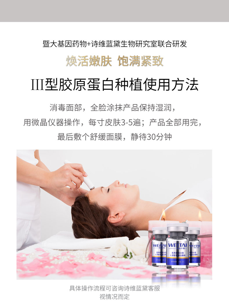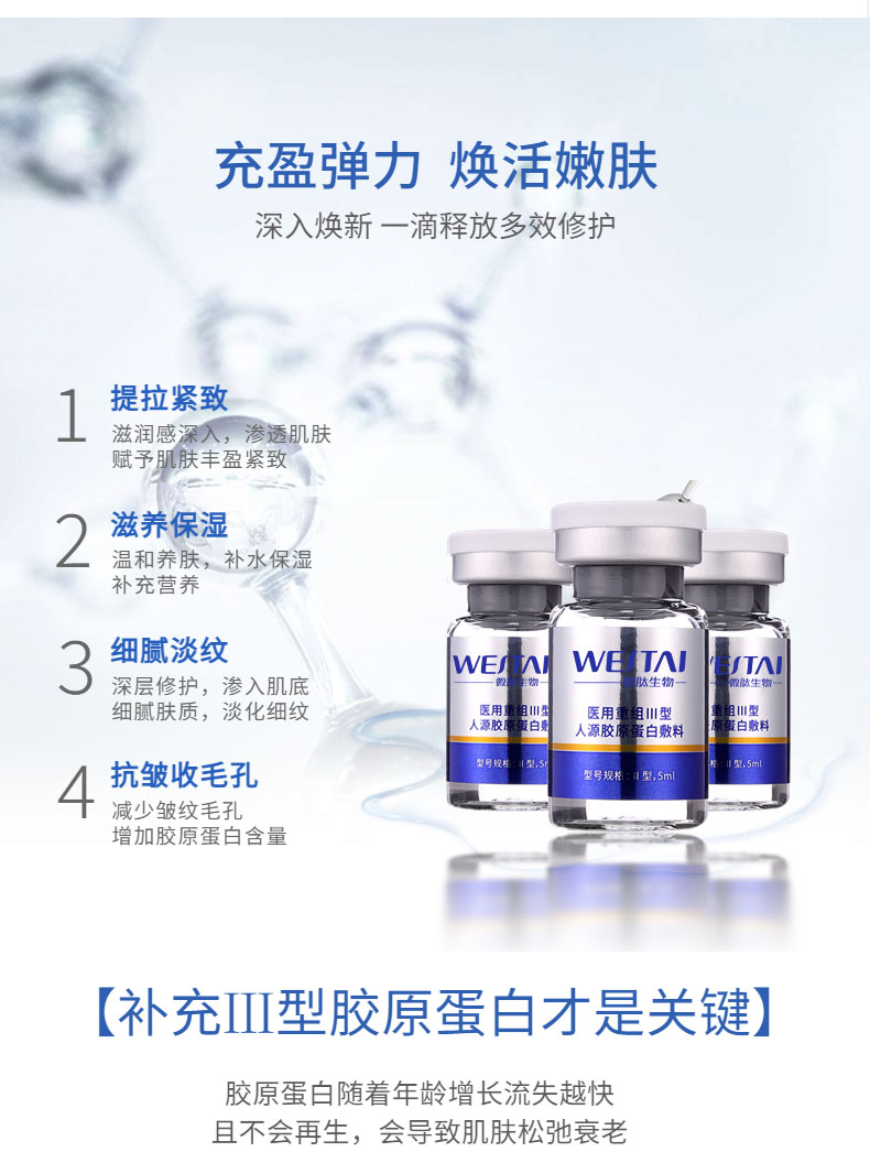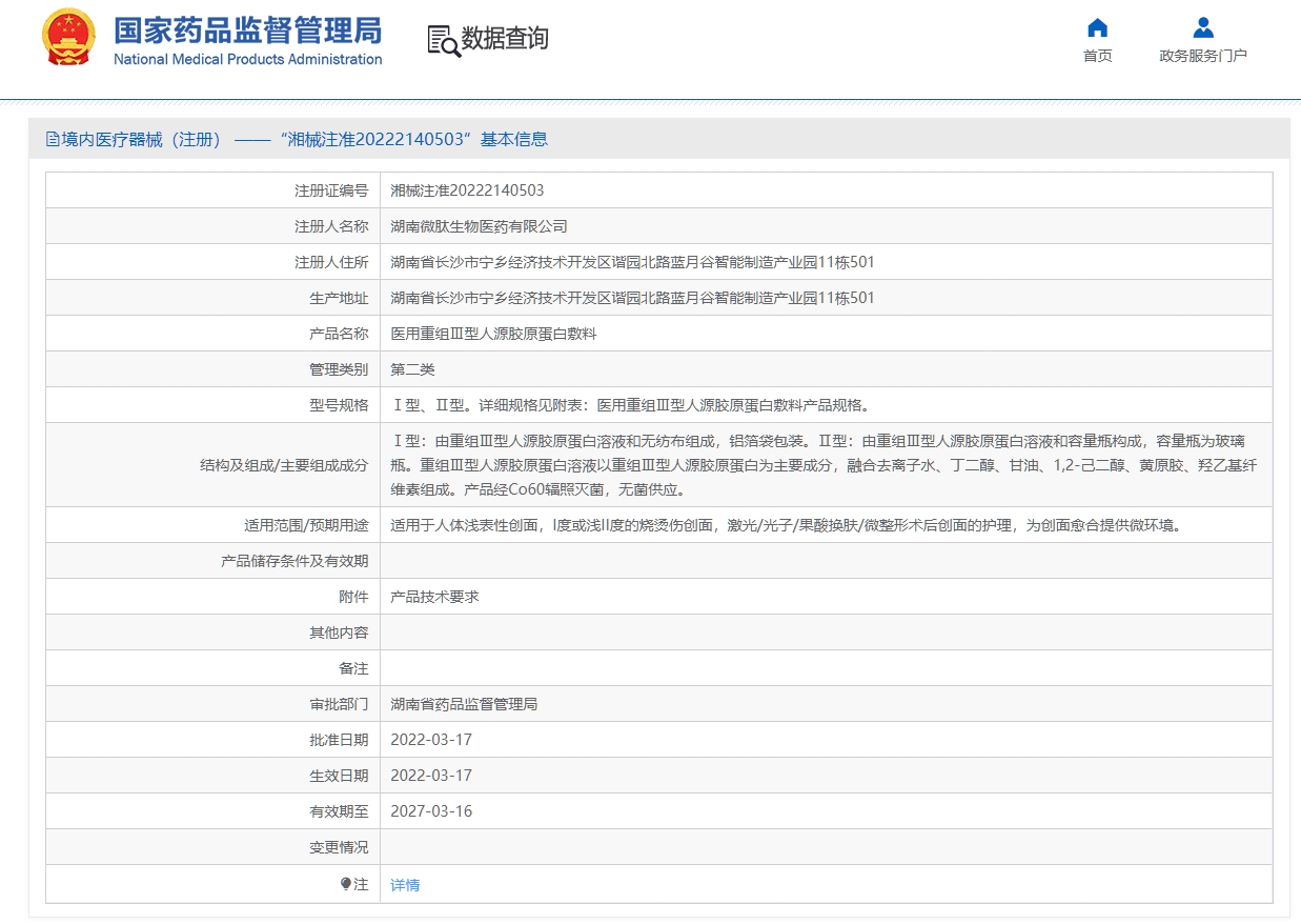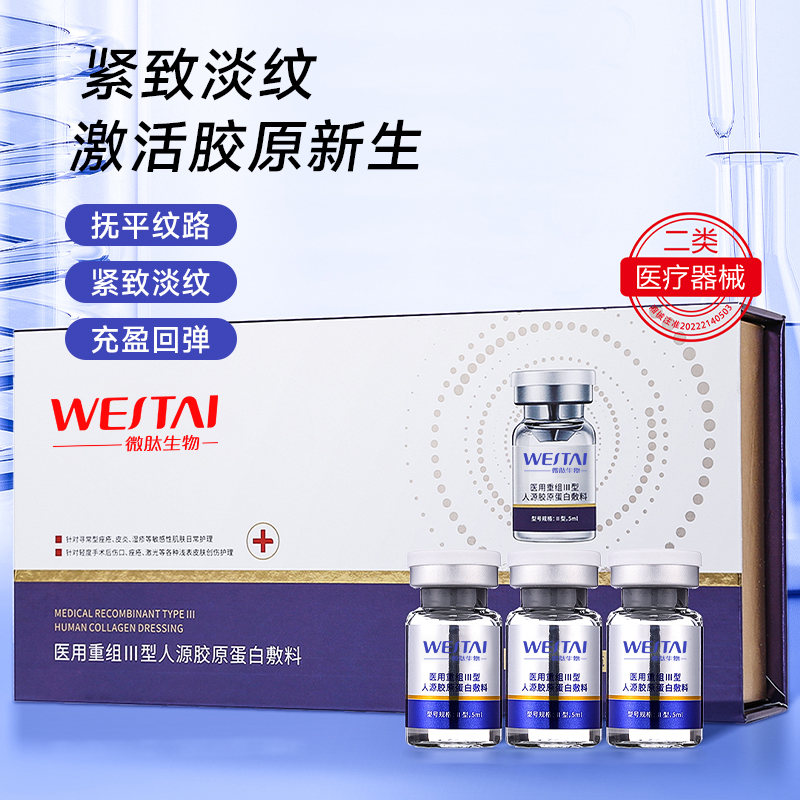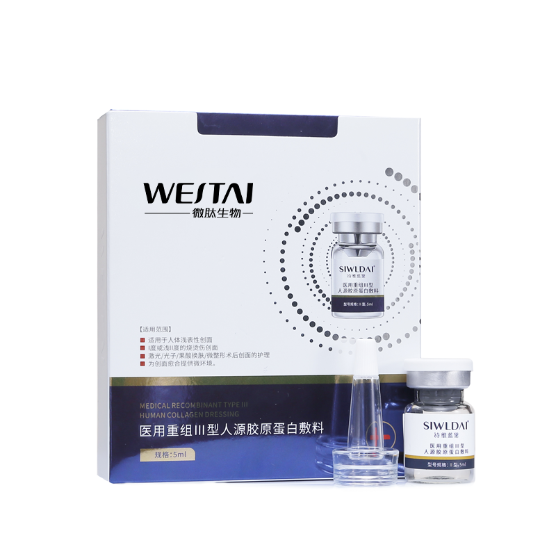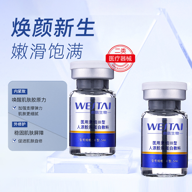 Ⅰ型:由重組Ⅲ型人源膠原蛋白溶液和無紡布組成,鋁箔袋包裝。Ⅱ型:由重組Ⅲ型人源膠原蛋白溶液和容量瓶構(gòu)成,容量瓶為玻璃瓶。重組Ⅲ型人源膠原蛋白溶液以重組Ⅲ型人源膠原蛋白為主要成分,融合去離子水、丁二醇、甘油、1,2-己二醇、黃原膠、羥乙基纖維素組成。產(chǎn)品經(jīng)Co60輻照滅菌,無菌供應(yīng)。