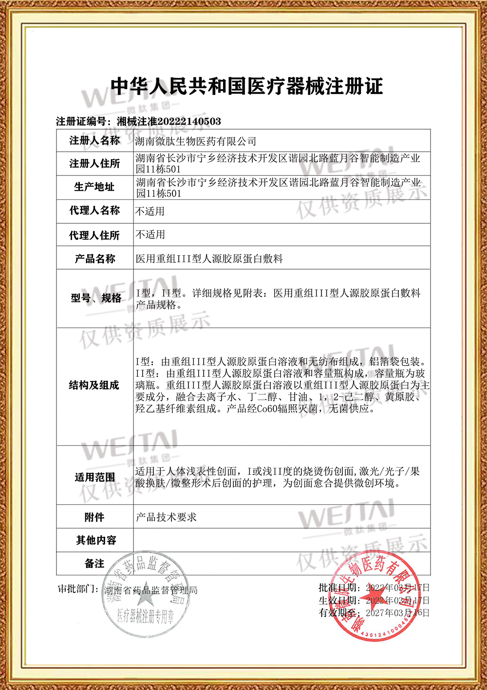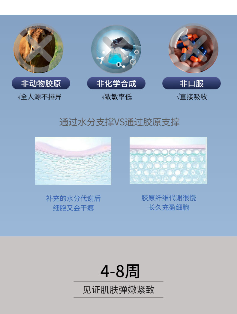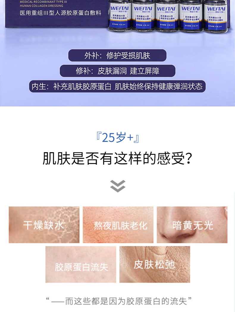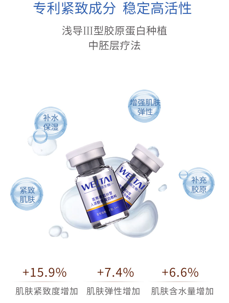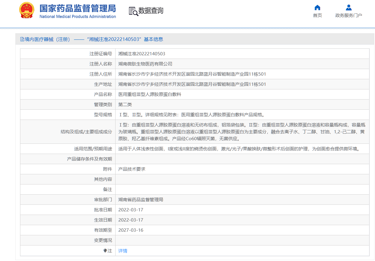 Ⅰ型:由重組Ⅲ型人源膠原蛋白溶液和無紡布組成,鋁箔袋包裝。Ⅱ型:由重組Ⅲ型人源膠原蛋白溶液和容量瓶構(gòu)成,容量瓶為玻璃瓶。重組Ⅲ型人源膠原蛋白溶液以重組Ⅲ型人源膠原蛋白為主要成分,融合去離子水、丁二醇、甘油、1,2-己二醇、黃原膠、羥乙基纖維素組成。產(chǎn)品經(jīng)Co60輻照滅菌,無菌供應(yīng)。