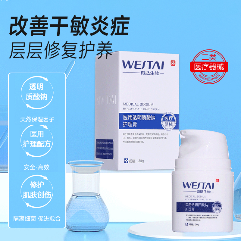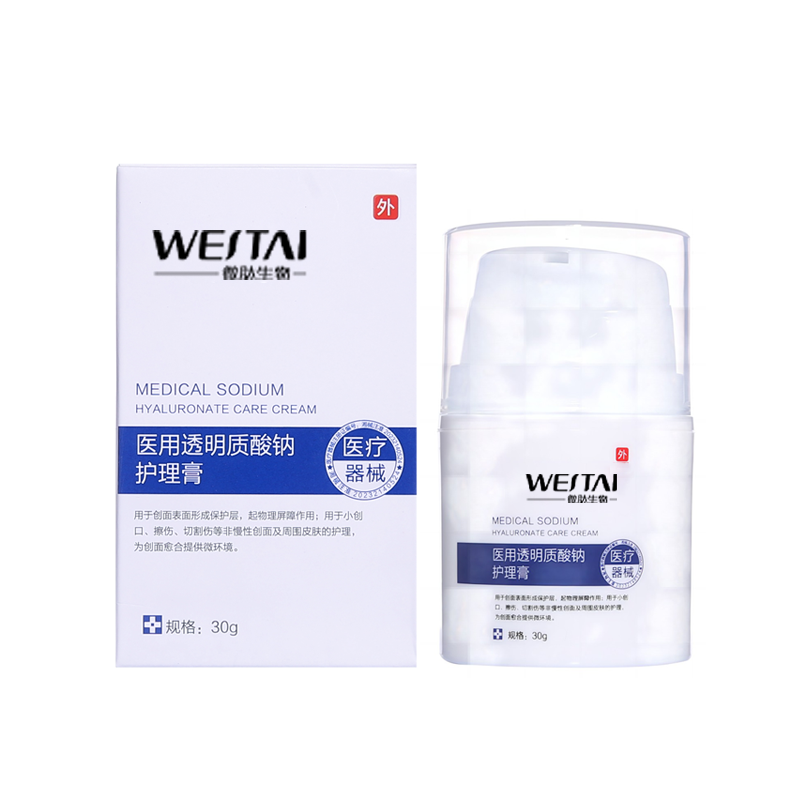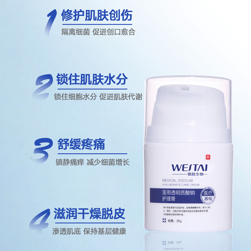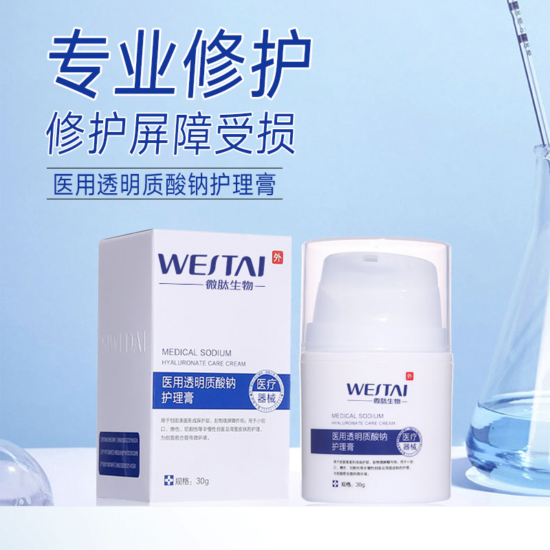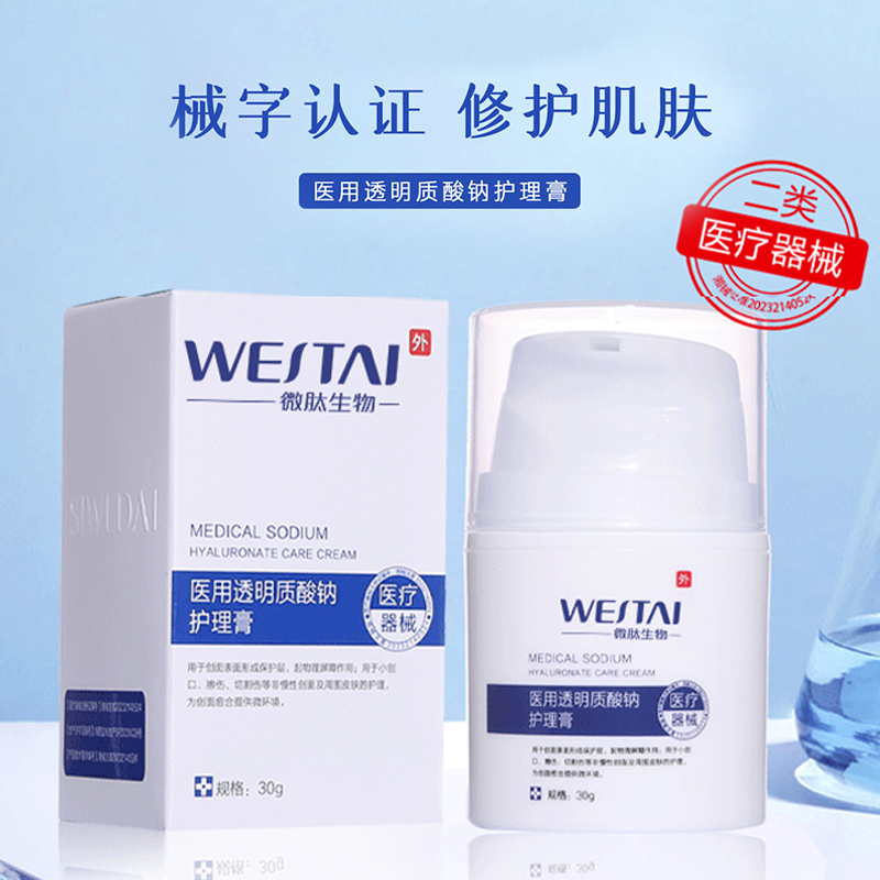 醫(yī)用透明質(zhì)酸鈉護(hù)理膏由護(hù)理膏和容器組成。容器為PE軟管、或塑料瓶(蓋為PP材質(zhì),外殼為AS材質(zhì),內(nèi)膽為PT材質(zhì))、或玻璃瓶;護(hù)理膏由水、甘油、透明質(zhì)酸鈉、鯨蠟硬脂基葡糖苷、鯨蠟硬脂醇、聚二甲基硅氧烷、辛酸/癸酸甘油三酯、苯氧乙醇和乙基己基甘油組成。