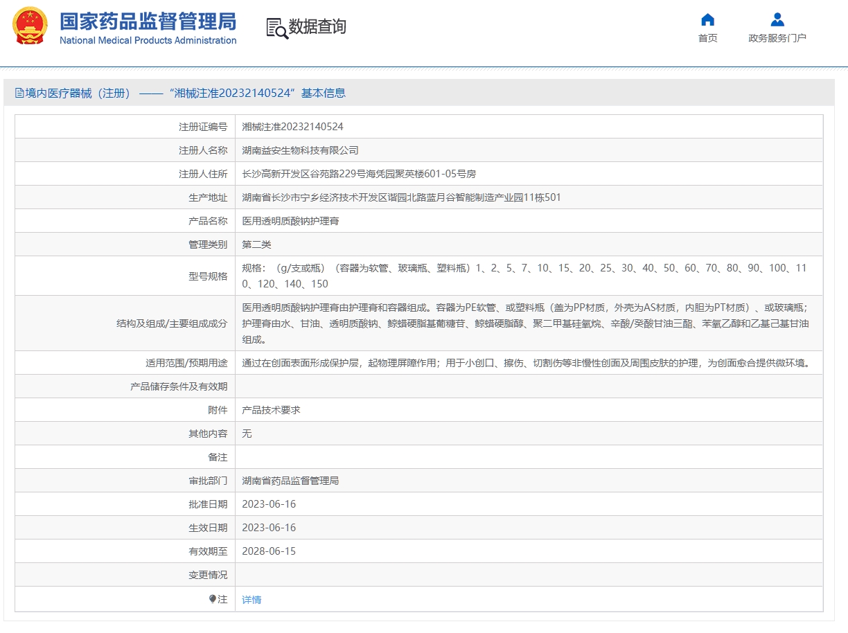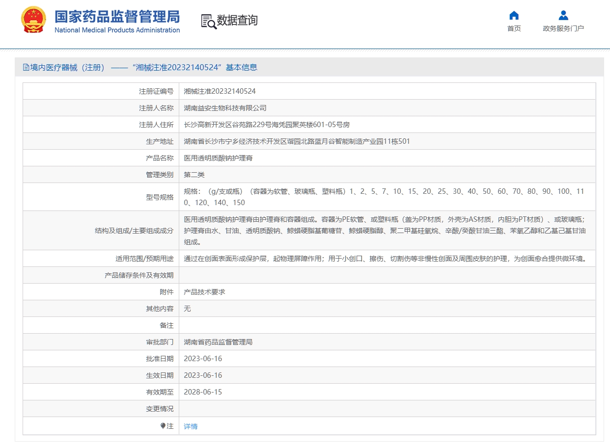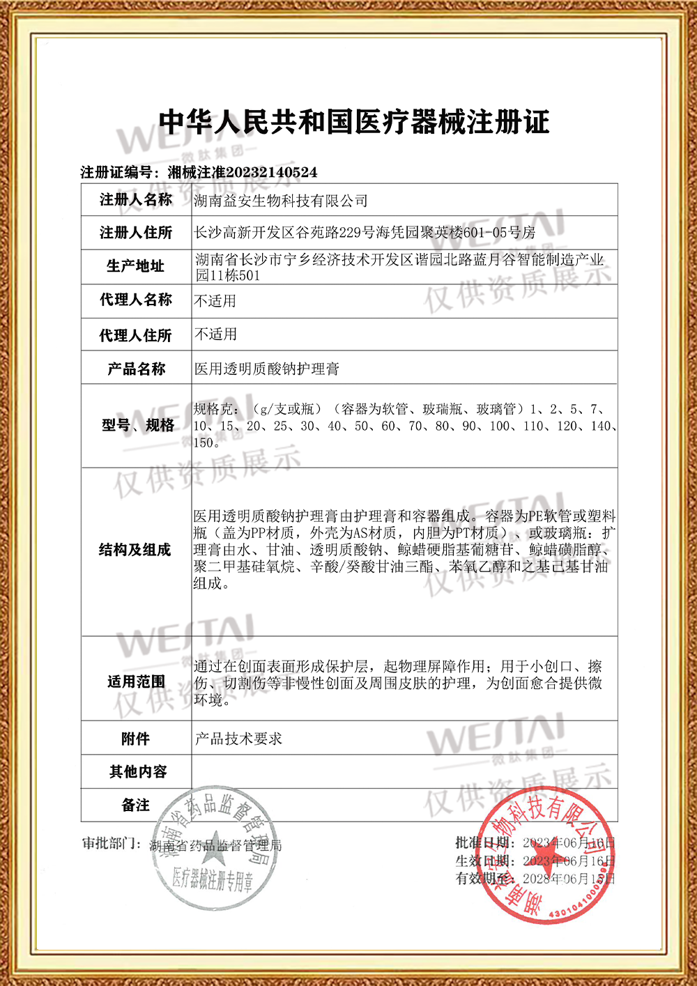 醫(yī)用透明質(zhì)酸鈉護(hù)理膏由護(hù)理膏和容器組成。容器為PE軟管、或塑料瓶(蓋為PP材質(zhì),外殼為AS材質(zhì),內(nèi)膽為PT材質(zhì))、或玻璃瓶;護(hù)理膏由水、甘油、透明質(zhì)酸鈉、鯨蠟硬脂基葡糖苷、鯨蠟硬脂醇、聚二甲基硅氧烷、辛酸/癸酸甘油三酯、苯氧乙醇和乙基己基甘油組成。