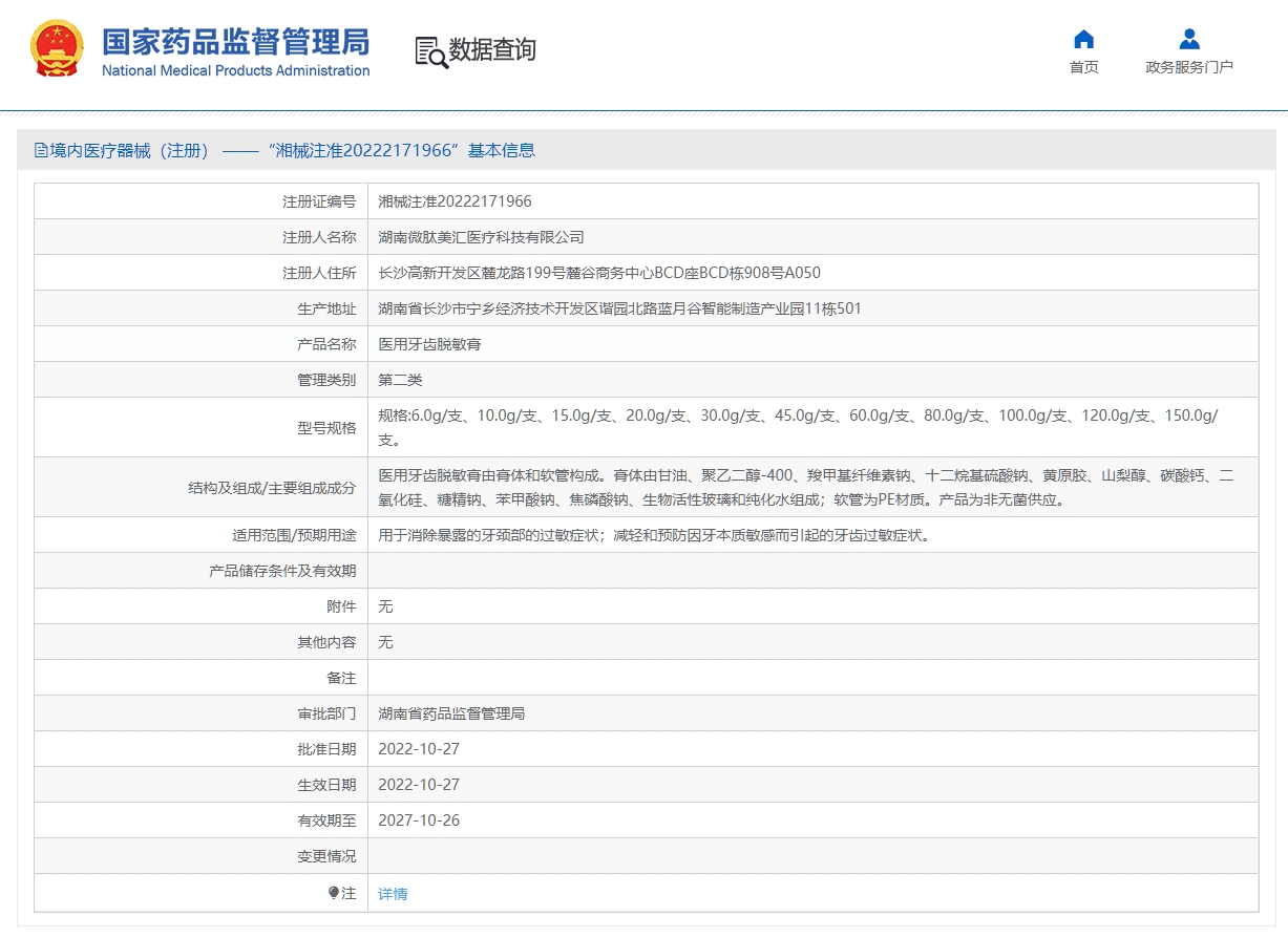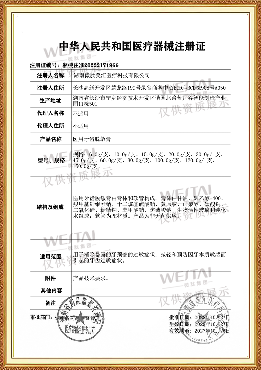 醫(yī)用牙齒脫敏膏由膏體和軟管構(gòu)成。膏體由甘油、聚乙二醇-400、羧甲基纖維素鈉、十二烷基硫酸鈉、黃原膠、山梨醇、碳酸鈣、二氧化硅、糖精鈉、苯甲酸鈉、焦磷酸鈉、生物活性玻璃和純化水組成;軟管為PE材質(zhì)。產(chǎn)品為非無菌供應(yīng)。